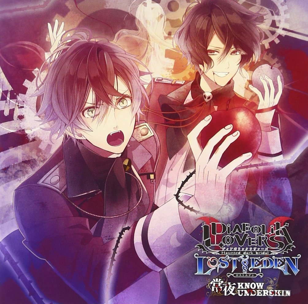 常夜 (Tokoyo) KNOW UNDER SKIN is the opening theme of the visual novel Diabolik Lovers LOST EDEN. It is performed by Ayato Sakamaki (CV: Hikaru Midorikawa), Kanato Sakamaki (CV: Yūki Kaji), Laito Sakamaki (CV: Daisuke Hirakawa), Shu Sakamaki (CV: Kōsuke Toriumi), Reiji Sakamaki (CV: Katsuyuki Konishi), and Subaru Sakamaki (CV: Takashi Kondō). The ending song, I.M.I.T.A.T.I.O.N G.A.M.E. is performed by Kino (CV: Tomoaki Maeno).